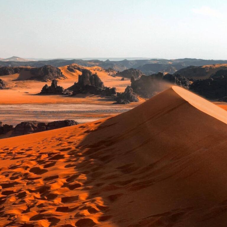 Laissez-vous envoûter par la magie de la Tadrart Rouge, avec ses majestueuses dunes aux couleurs changeantes et ses formations rocheuses évoquant des épaves de navires au milieu de l’océan ou des châteaux fortifiés. Les plus téméraires pourront tenter l’ascension de la mythique dune de Tin-Merzouga.